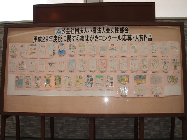 本日は、小樽法人会 女性部会 平成29年度 税に関する絵はがきコンクールの作品をご紹介いたします。 小樽市内の小学校4・5・6年生からの応募作品を展示しています。 どの作品もはがきサイズですが、力作ですね。そして、とてもきれいな色遣いです。 実際の作品を近くでご覧ください。 『優秀賞』などの作品は、小樽法人会のホームページでもご覧になれます。 2017年11月22日 事務局からのお知らせ « 前の投稿 次の投稿 »