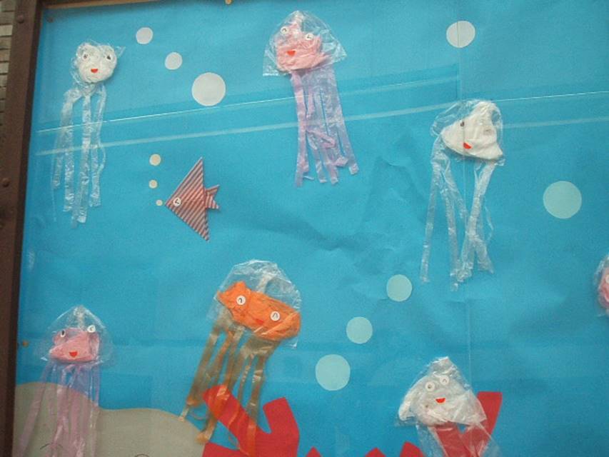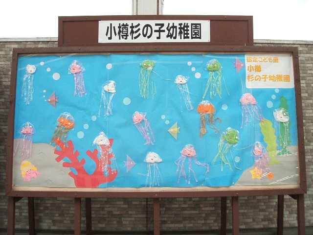 本日紹介するのは、「杉の子幼稚園」の作品です。 涼しげな海の中を楽しそうなクラゲたちがプカプカ泳いでいる作品です。 見てると涼しくなるような作品で、クラゲたちの表情も楽しいです。 ぜひ見に来て下さいね。 2021年8月6日 事務局からのお知らせ « 前の投稿 次の投稿 »